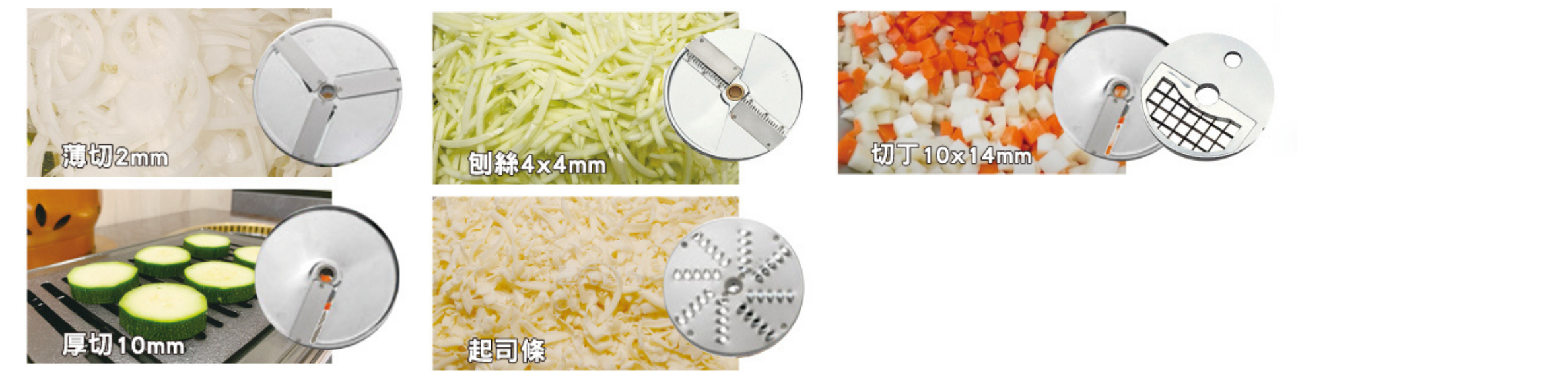 | 刀盤多樣性 | 依照餐廳所需選擇切絲、切片或切丁等不同刀盤作使用 |